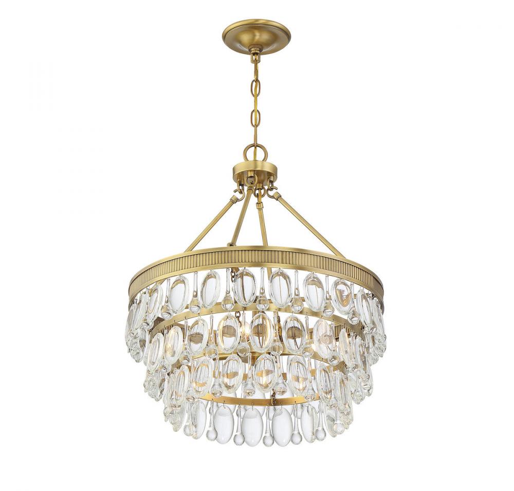 The Savoy House Windham 4-light pendant is a glamorous, modern look that brings a touch of luxury and elegance to your home. The circular frame, finished in warm brass, holds three descending tiers of gorgeous clear crystals in alternating oval and teardrop shapes that add wonderful texture and sparkle. Four 60-watt candelabra size bulbs provide beautiful illumination for your glam, contemporary or transitional decor style. The pendant is 20" wide and 22" high, creating a perfect fit for your dining area, living room, foyer, great room, bedroom, stairway, kitchen or family room.