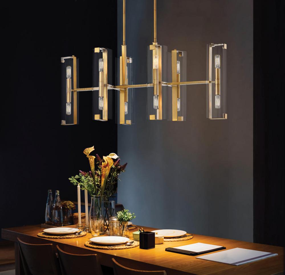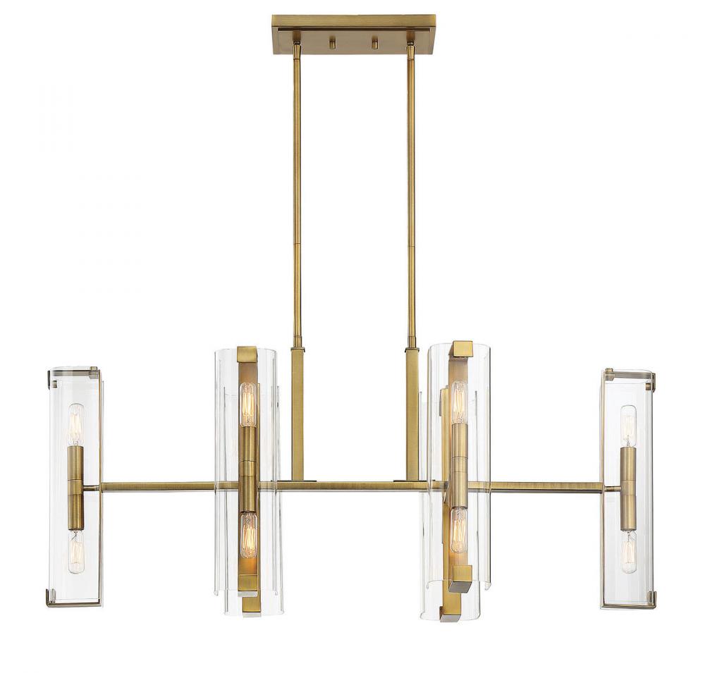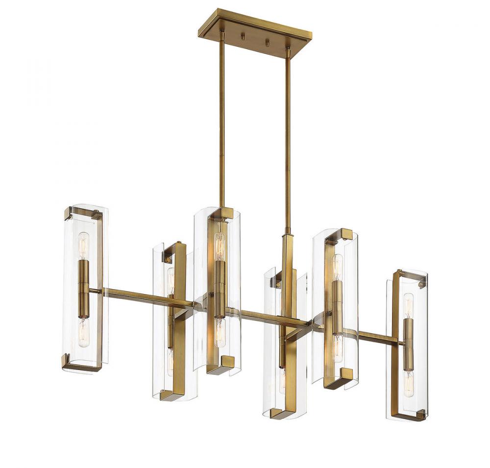 Sleek and sophisticated! The Savoy House Winfield 12-light linear chandelier has an eye-catching design, yet the clean lines and transparent glass keep the mood serene. Bold straight lines of the downrod, frame and bulb sockets are highlighted by a warm brass finish. Each of the six light arms holds two 60W candelabra size bulbs, one facing up and one facing down, for splendid illumination through the pristine clear glass shades. This linear chandelier measures 38" long and 17.25" high. With included 30 degree swivel and extension rods, it has an up to 69.25" hanging height and accommodates sloped ceilings. Overall, it’s a chic and stylish fixture for your dining room, living room, entryway, kitchen island, family room, bar, office or media room.