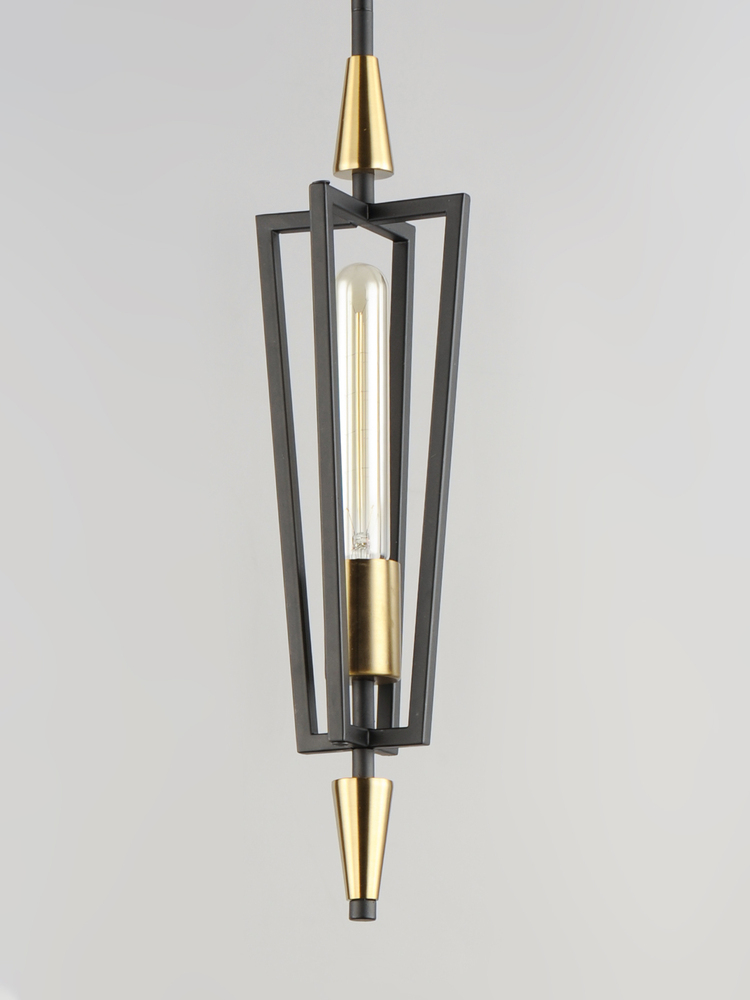 Sharp lines radiate from a pointed pin central body creating geometric angled wings that are sandwiched between matching conical fonts. Finished in a combination Antique Brass and Black, this collection is both contemporary and warm. Complete this look wit
