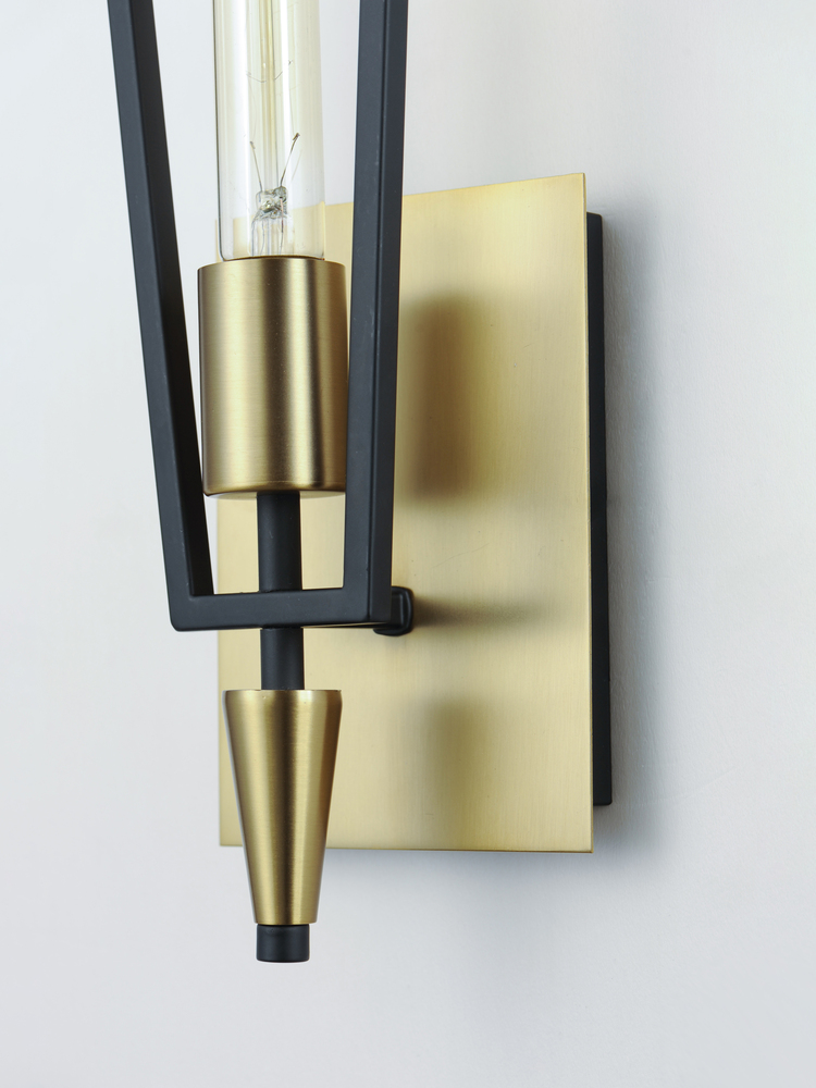 Sharp lines radiate from a pointed pin central body creating geometric angled wings that are sandwiched between matching conical fonts. Finished in a combination Antique Brass and Black, this collection is both contemporary and warm. Complete this look wit
