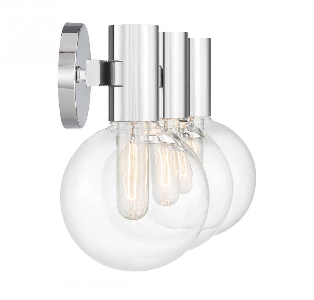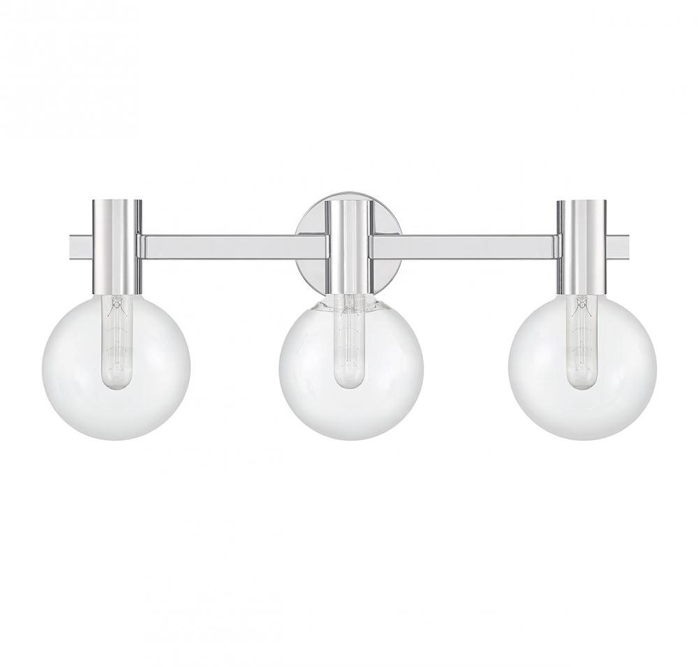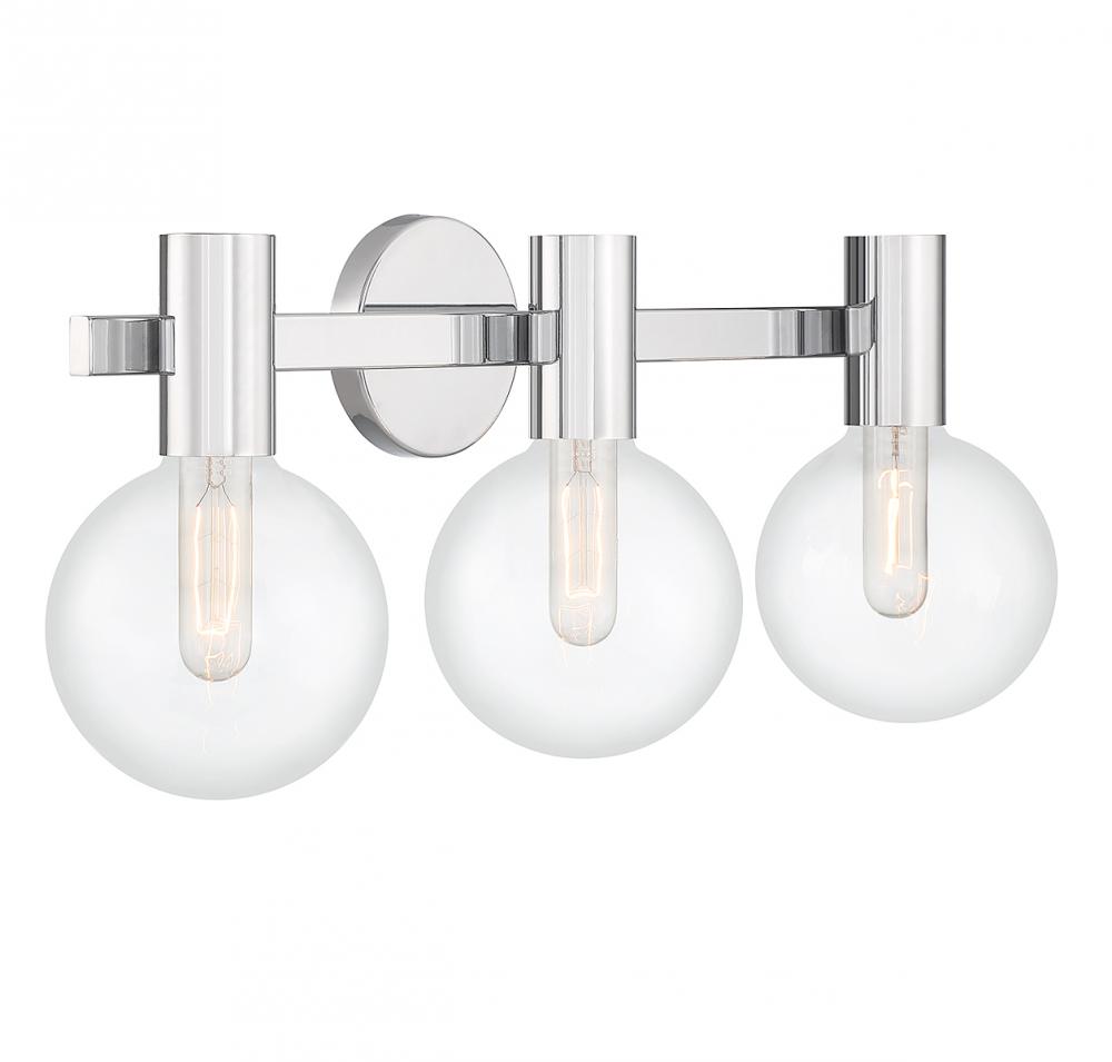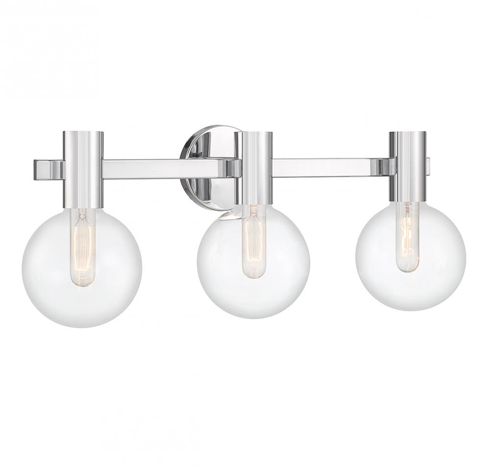 This Savoy House Wright 3-light bath vanity light showcases streamlined style that makes it ideal for any bathroom. Round clear glass shades add an extra dimension and extra protection for the light bulbs within. Chrome finish. Wright is 25" in width, 10" in height and extends 7.5" from the wall. Uses 3 standard size bulbs of up to 60 watts per bulb (bulbs not included). We recommend using tubular shaped bulbs.