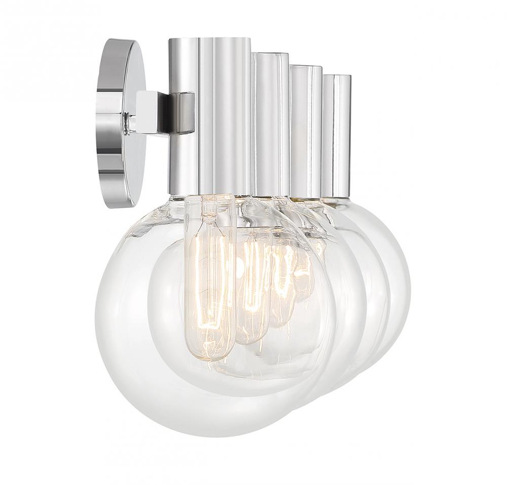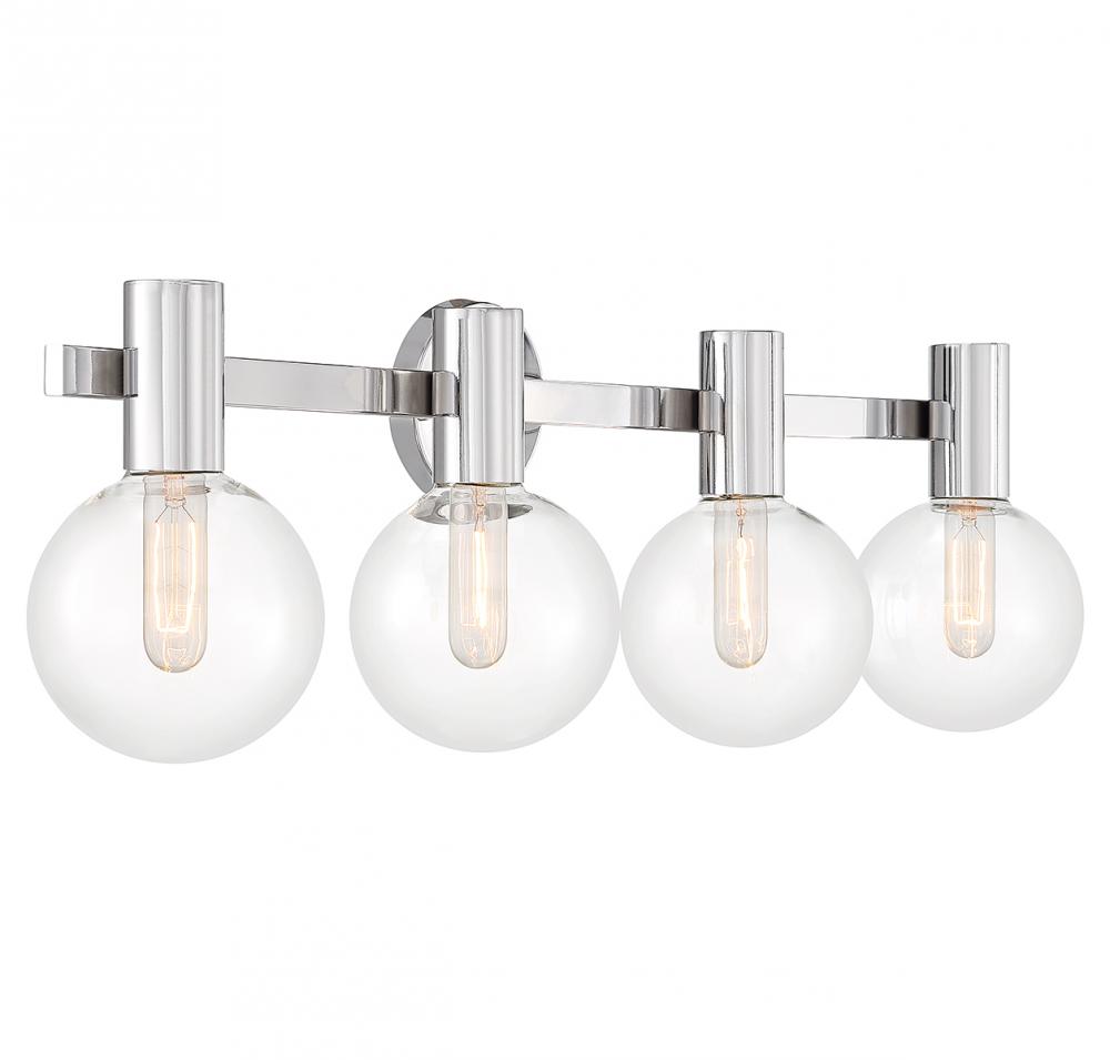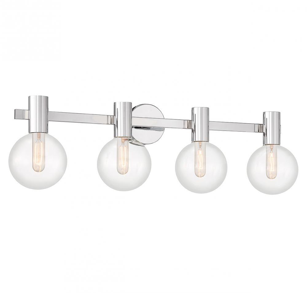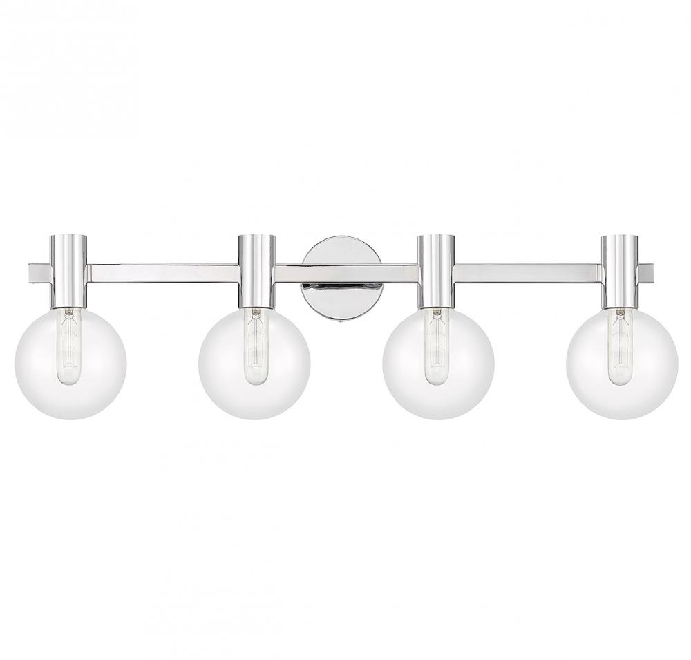 This Savoy House Wright 4-light bath vanity light showcases streamlined style that makes it ideal for any bathroom. Round clear glass shades add an extra dimension and extra protection for the light bulbs within. Chrome finish. Wright is 34" in width, 10" in height and extends 7.5" from the wall. Uses 4 standard size bulbs of up to 60 watts per bulb (bulbs not included). We recommend using tubular shaped bulbs.