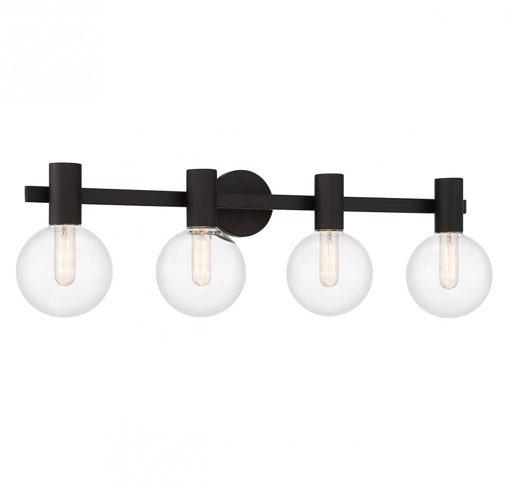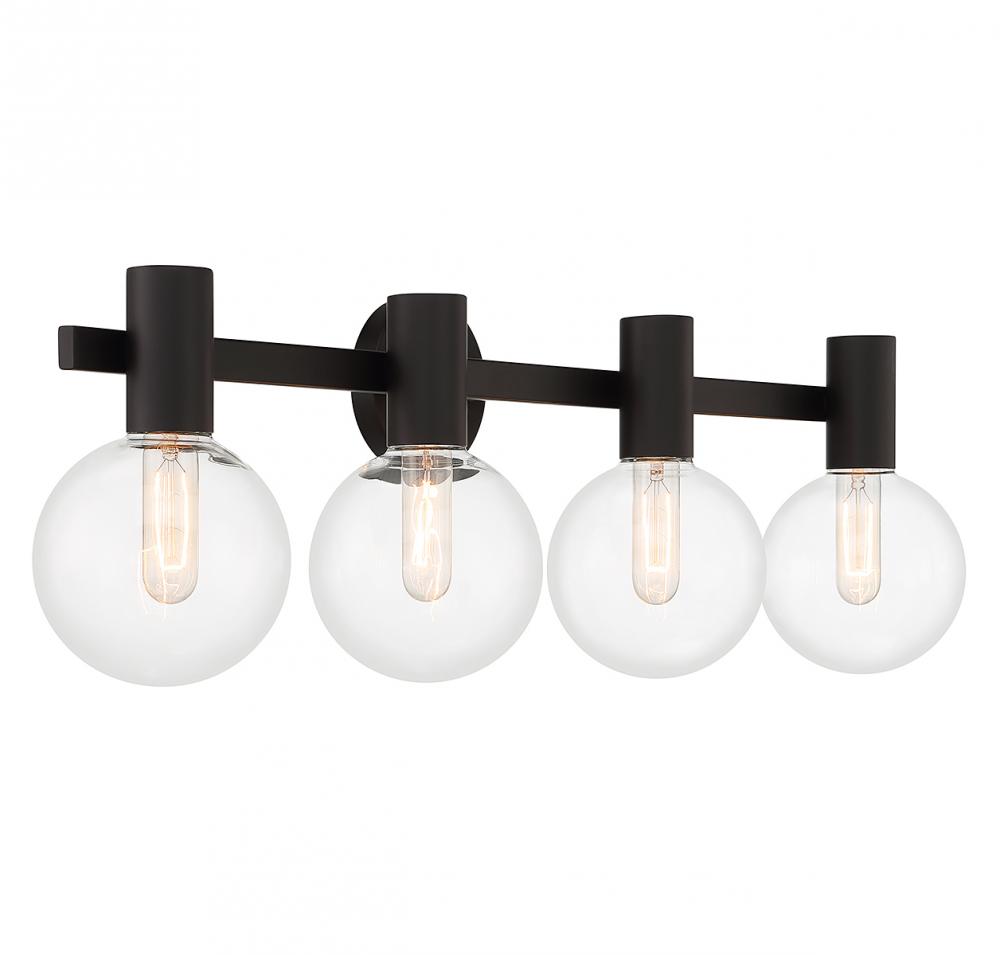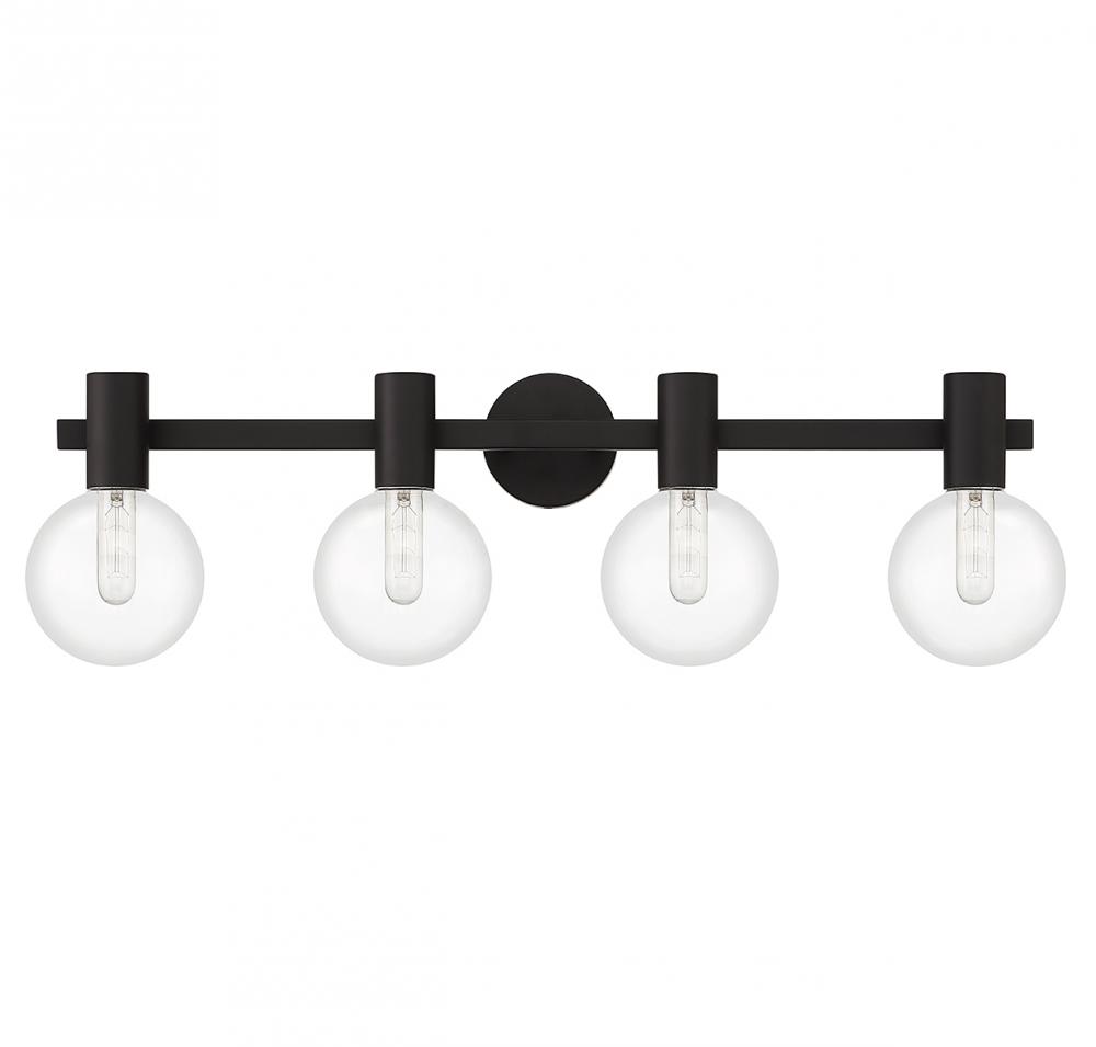 This Savoy House Wright 4-light bath vanity light showcases streamlined style that makes it ideal for any bathroom. Round clear glass shades add an extra dimension and extra protection for the light bulbs within. Matte black finish. Wright is 34" in width, 10" in height and extends 7.5" from the wall. Uses 4 standard size bulbs of up to 60 watts per bulb (bulbs not included). We recommend using tubular shaped bulbs.