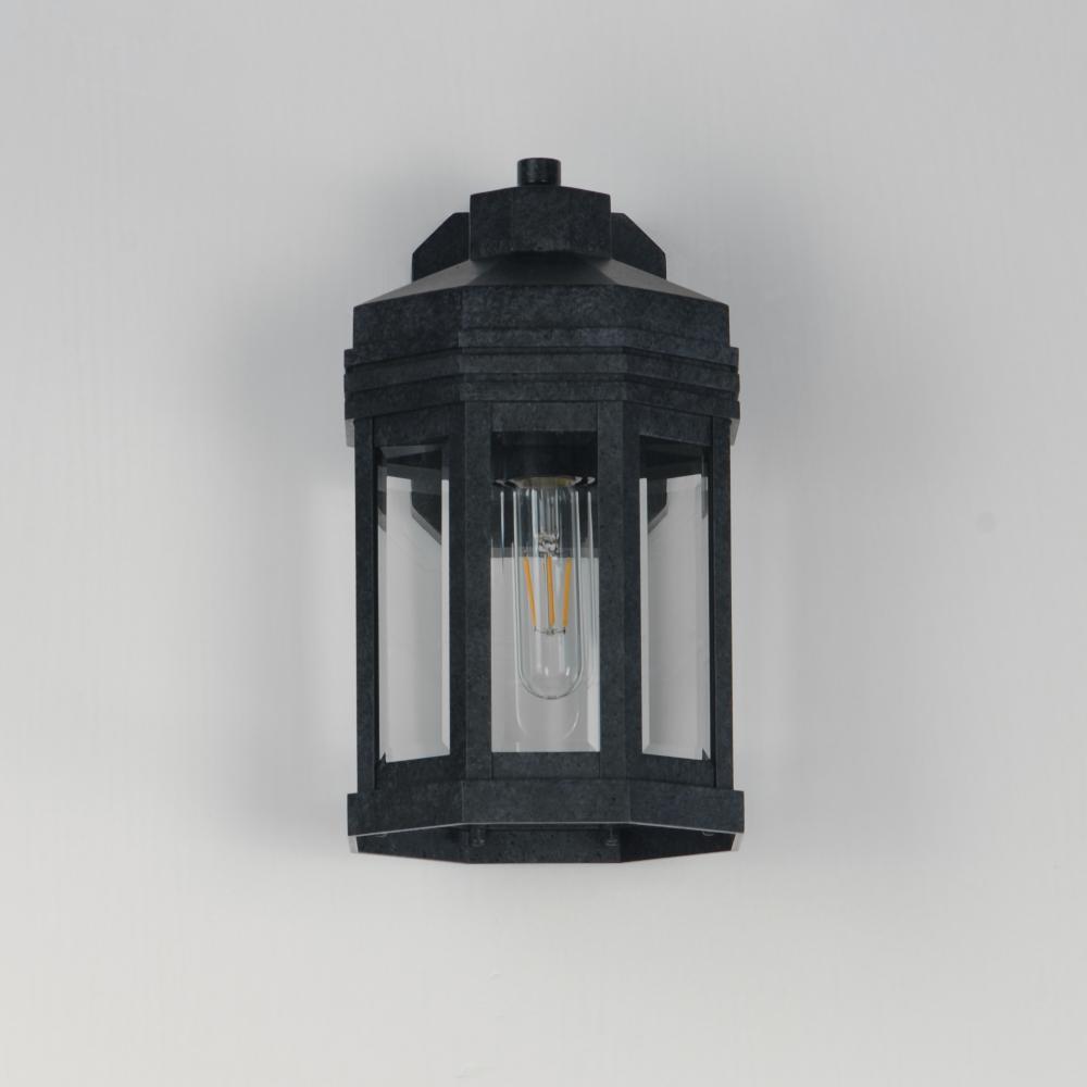 Inspired by the intricate geometric motifs of the iconic architect, the Wright collection of outdoor lighting features a hexagonal frame with tiered louvers along its hood. Beveled at its edges, the Clear glass panes encase the lighting cluster within a ro