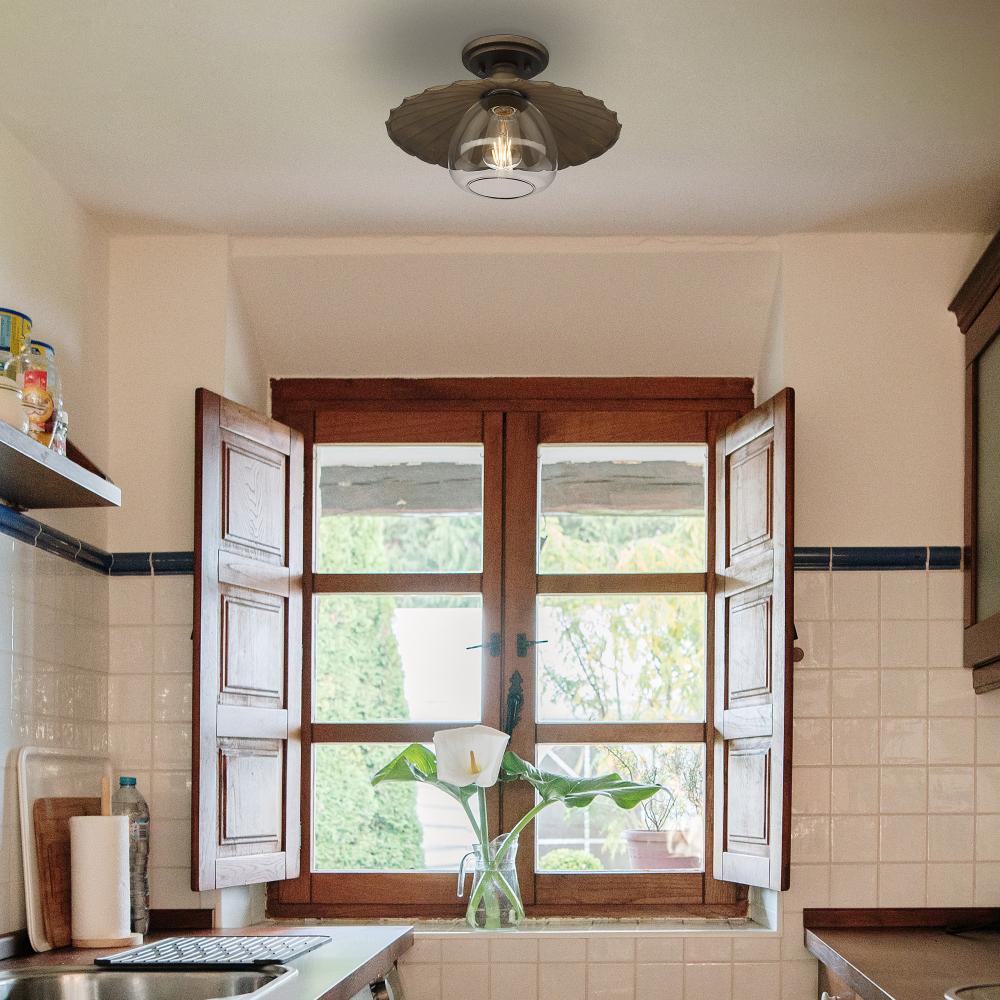 Bring traditional elegance into your home with the Wry Lighting Clemence 1-light Flush Mount in Dark Rust. Featuring a glass shade and a Dark Rust frame, it creates a welcoming atmosphere. The clear glass shade offers brilliant, unobstructed light, polished to a high-gloss shine, allowing the bulb's beauty to shine through. Embrace the cozy charm of country living with this flush mount light that highlights the classic barn-style design and decorative scalloped edge, perfectly suited for rustic interiors. The Dark Rust finish embraces the raw beauty of natural corrosion, providing an authentic, time-worn character ideal for vintage-inspired spaces. This fixture is perfect for low ceilings in hallways, closets, and bathrooms, and it is damp location rated, making it suitable for covered and semi-enclosed spaces. Customize your lighting with adjustable directional heads to highlight specific areas easily. Overall dimensions are 13.75"W x 8.5"H x 13.75"D, and it requires 1 E26 Medium base bulb (not included) with a maximum wattage of 100. Experience the perfect blend of quality and style in your home with the Wry Lighting Clemence flush mount.