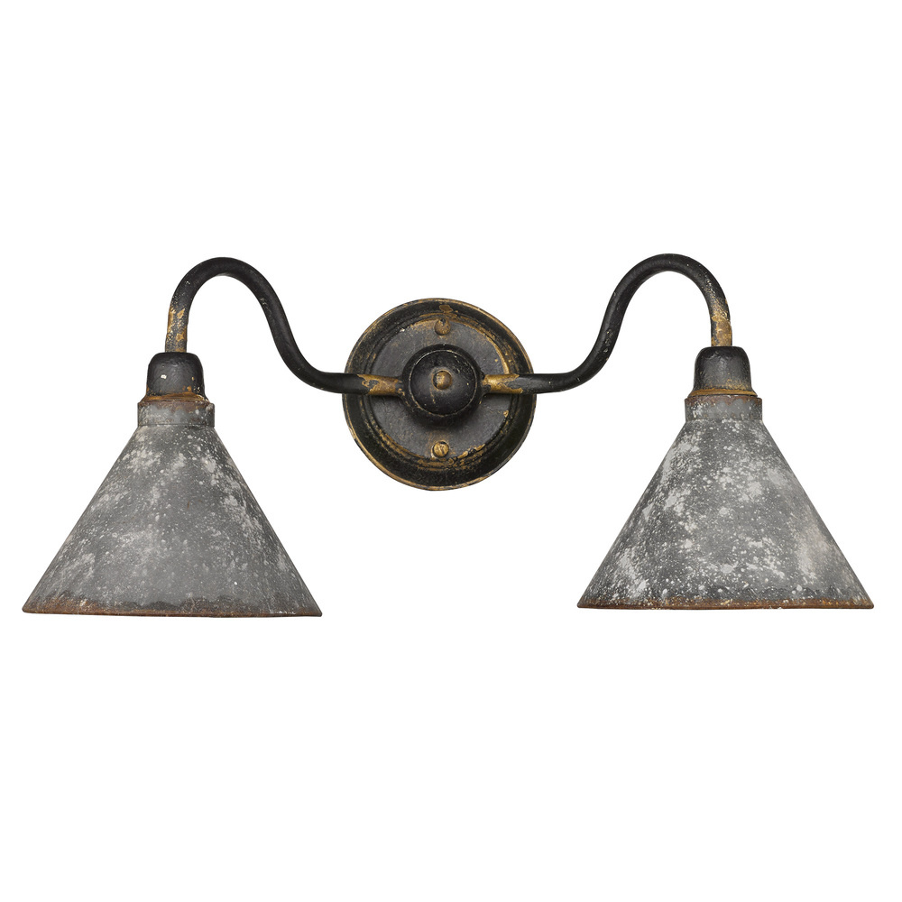 Bring traditional elegance into your home with the Wry Lighting Jasper 2-light Vanity in Antique Black Iron. Featuring a metal shade and a striking Antique Black Iron frame, it creates a welcoming atmosphere. The rustic galvanized steel shade showcases heavily weathered details that reflect an authentic farmhouse charm while providing a warm light with an antiqued golden-orange finish inside. This deeply textured finish tells a story of time, revealing glimpses of antiqued gold as it adds a powerful statement of handcrafted character to your space. Ideal for bathrooms, it's damp location rated, ensuring beauty in covered and semi-enclosed areas. Installation is straightforward, requiring 2 E26 Medium base bulbs with a maximum wattage of 100 each, while the overall dimensions are 22.5"W x 9.75"H x 10"D. Upgrade your space with quality craftsmanship and a timeless design that complements your rustic aesthetic.