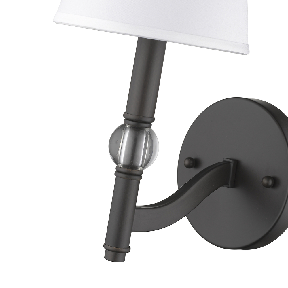 Bring modern elegance into your home with the Wry Lighting Waverly 1-light Wall Sconce. Featuring a Fabric shade and a Rubbed Bronze frame, it creates a welcoming atmosphere. The classic white fabric shade offers a crisp, bright color with a smooth weave, providing a soft, glare-free glow when illuminated. Embrace the warmth of the Rubbed Bronze finish, which reveals subtle highlights for a beautiful sense of depth and inviting glow. Ideal for indoor spaces not subject to moisture, this wall sconce enhances hallways, stairways, and bathrooms while adding cozy ambiance in bedrooms and dining areas. Requires 1 E12 Candelabra base bulb (not included) with a maximum wattage of 60. Dimensions: 6"W x 12.25"H x 8.25"D. Experience quality lighting solutions that blend style and practicality seamlessly.