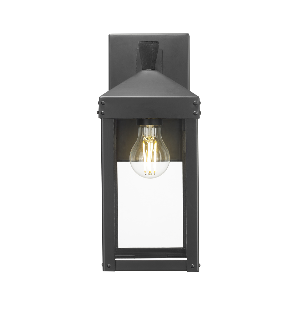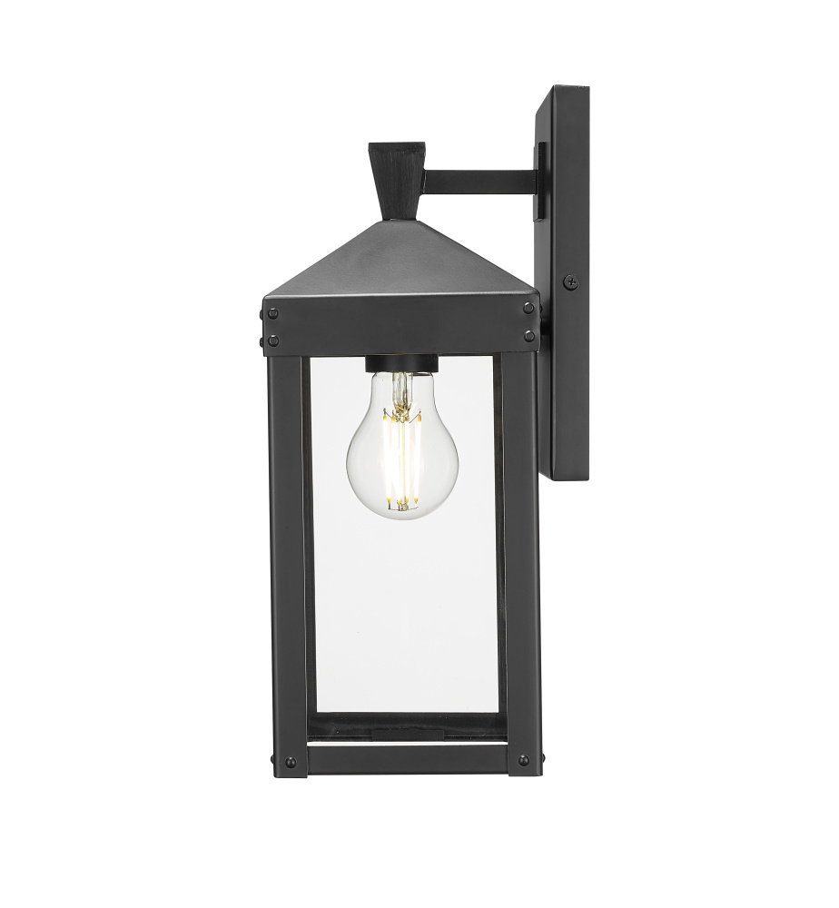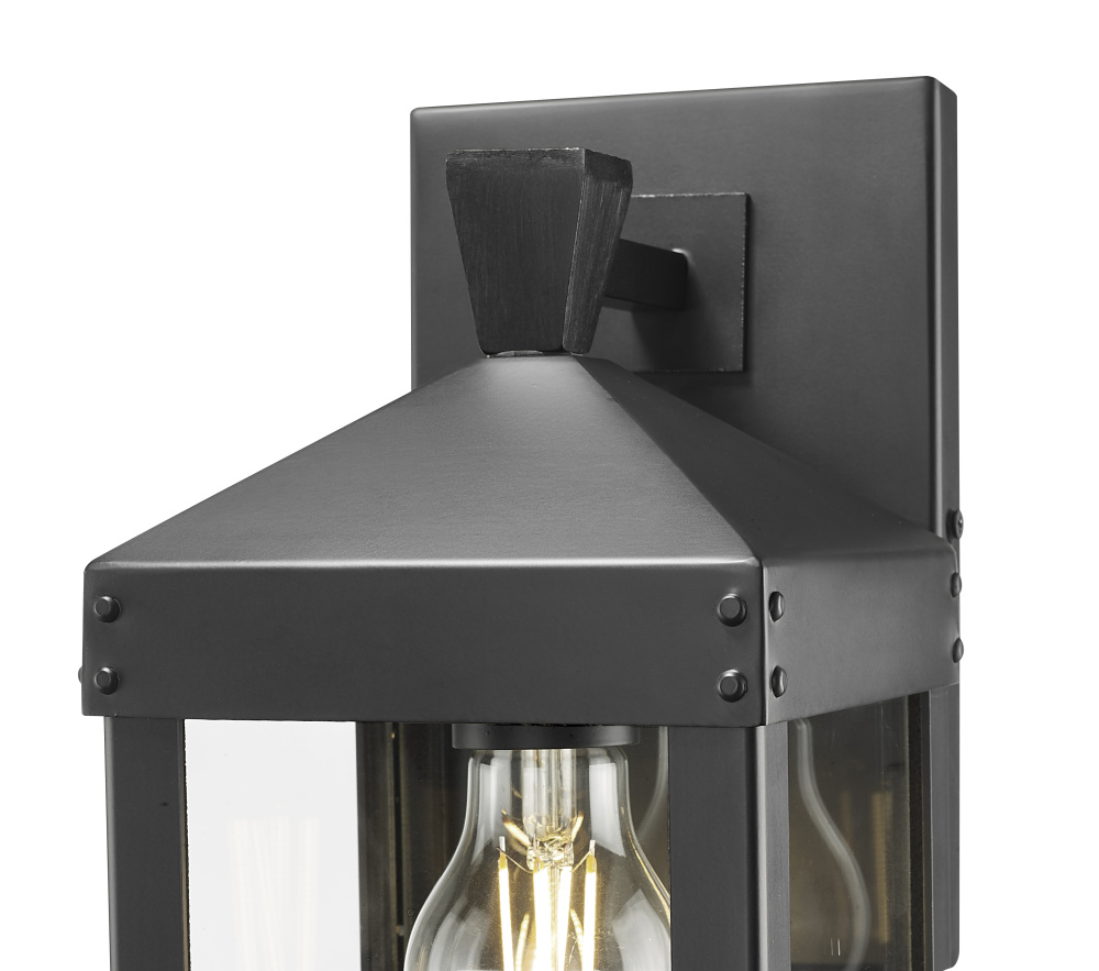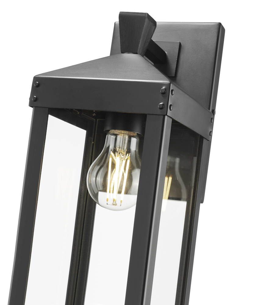 The Yates Family of exterior lighting is distinguished by its elongated profile and minimal framework. Oversized clear glass panels provide optimum illumination, and the angled lines of stylized cover and finial complete the contemporary look. Finished in durable powder coat black, these fixtures are available as 1- or 3-light sconces and are the perfect statement piece for any modern exterior front porch, walkway, or loggia.