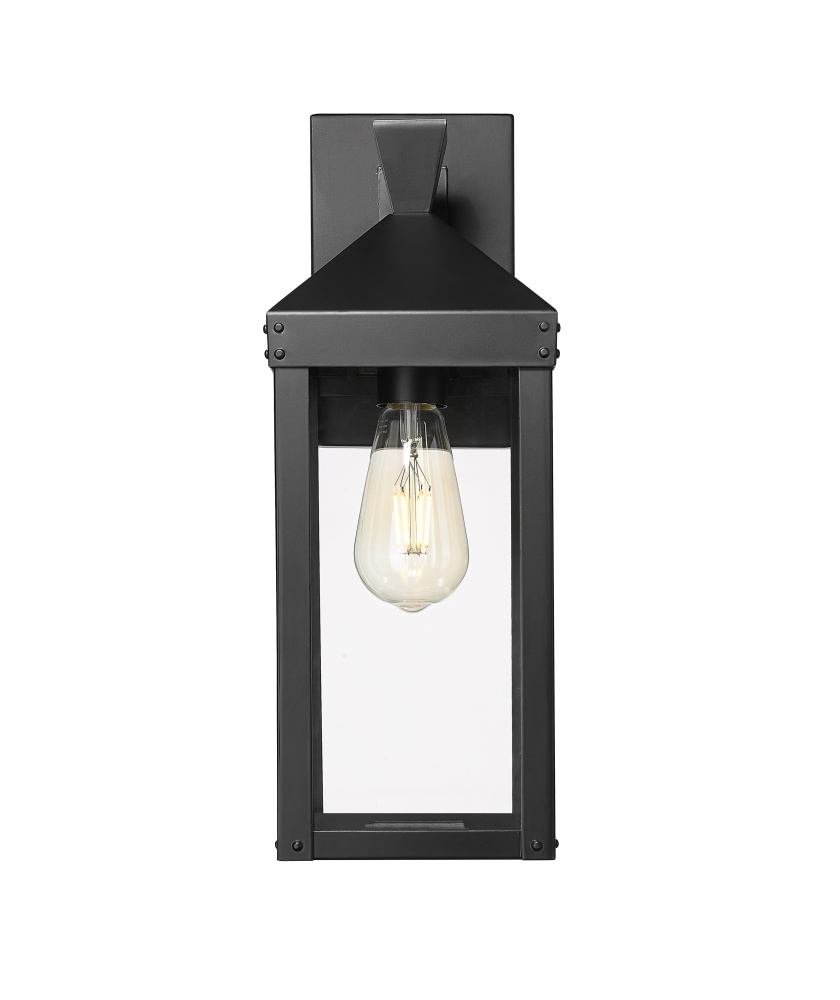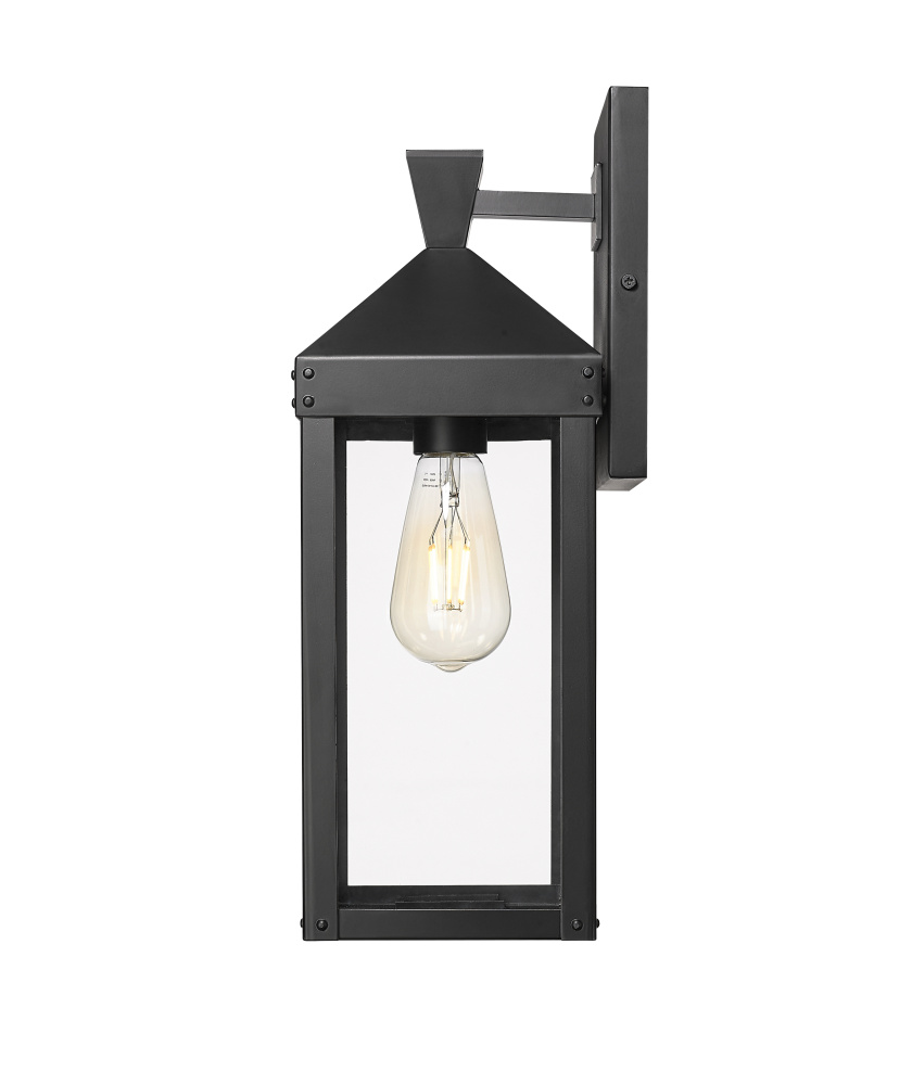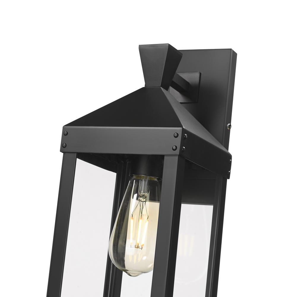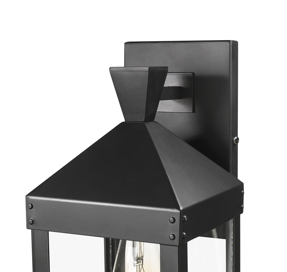 The Yates Family of exterior lighting is distinguished by its elongated profile and minimal framework. Oversized clear glass panels provide optimum illumination, and the angled lines of stylized cover and finial complete the contemporary look. Finished in durable powder coat black, these fixtures are available as 1- or 3-light sconces and are the perfect statement piece for any modern exterior front porch, walkway, or loggia.
