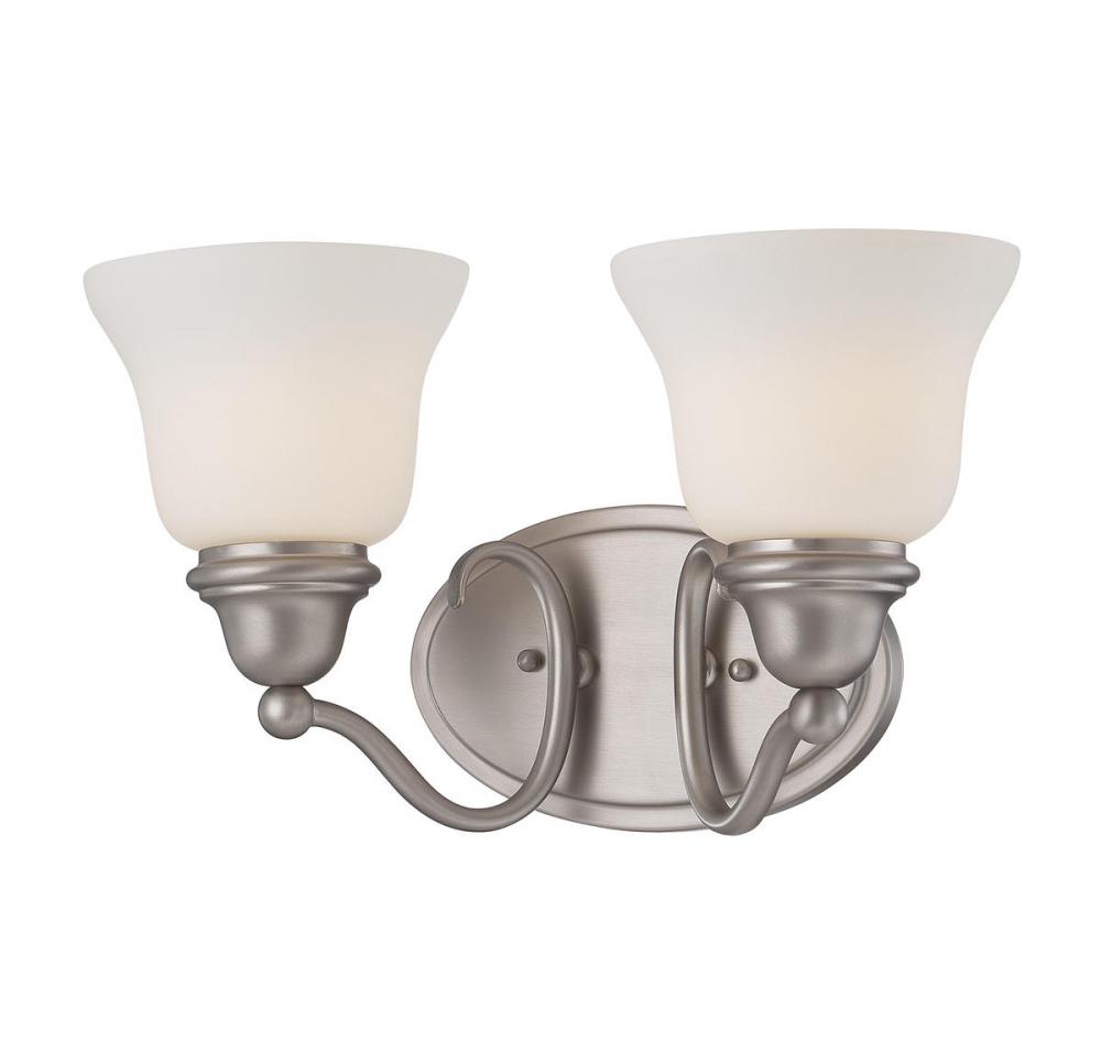 The Savoy House Yates has classic traditional style for flattering light in the bath. The style is elegant and familiar, making it a perfect choice above the vanity. The oval wall plate supports two graceful curved arms with bell-shaped shades of white glass and decorative finials finished in pewter. Each glass shade encloses a 60W standard size bulb for soft, glare-free illumination. The fixture measures 15" wide, 8.75" high and extends 7.5" from the wall. Plus, this bath bar may be mounted as uplight or downlight. Either way, Yates is timeless style for your bathroom or powder room.