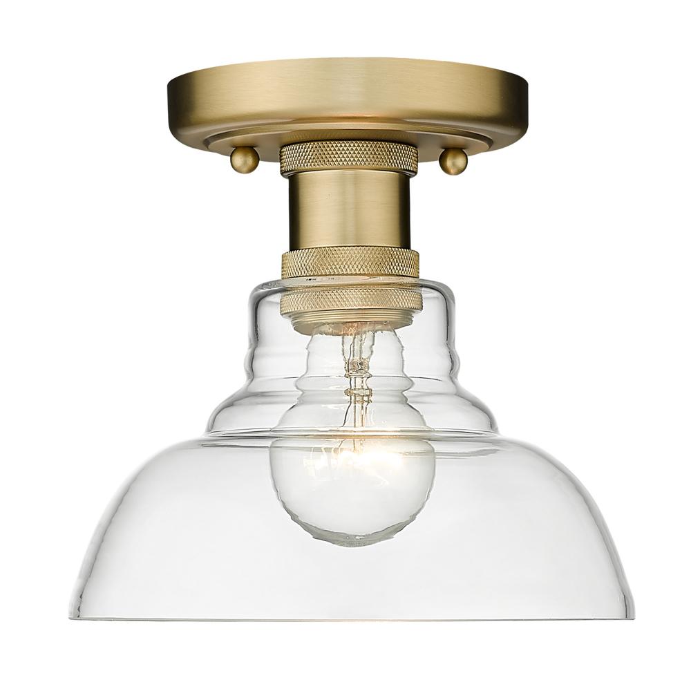Bring modern sophistication into your home with the Yep by Golden Lighting Carver 1-light Flush Mount in Brushed Champagne Brass. Featuring a glass shade, it creates a welcoming atmosphere. The clear glass shade offers brilliant, unobstructed light, revealing the beauty of the bulb and fixture's design. Its polished finish beautifully complements the light while providing a clean, timeless appeal. Constructed with a damp location rating, this fixture is perfect for covered and semi-enclosed spaces like bathrooms and laundry rooms. Ideal for low ceilings in hallways, closets, and more, it seamlessly merges compact design with wide illumination. Overall Dimensions: 7.5"W x 7"H x 7.5"D. Requires 1 E26 Medium base bulb (not included), with a maximum wattage of 60. Elevate your space with this stylish fixture, reflecting quality and contemporary design.