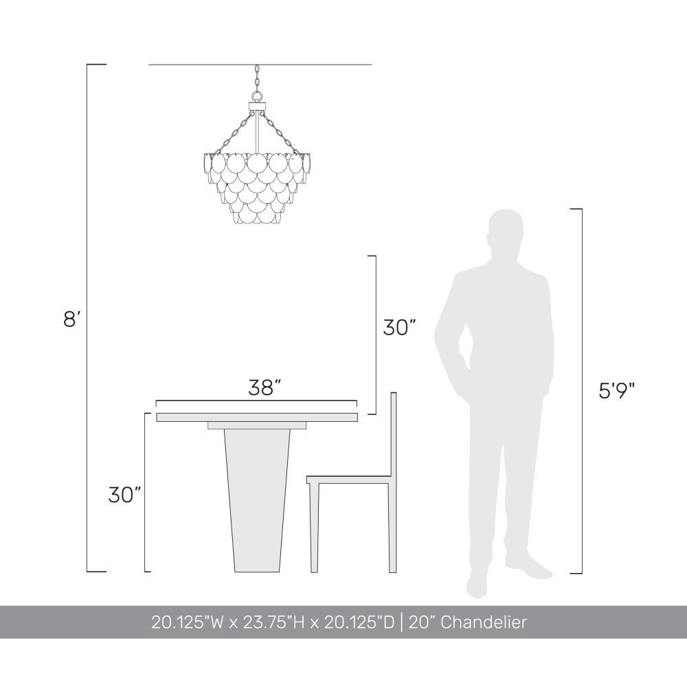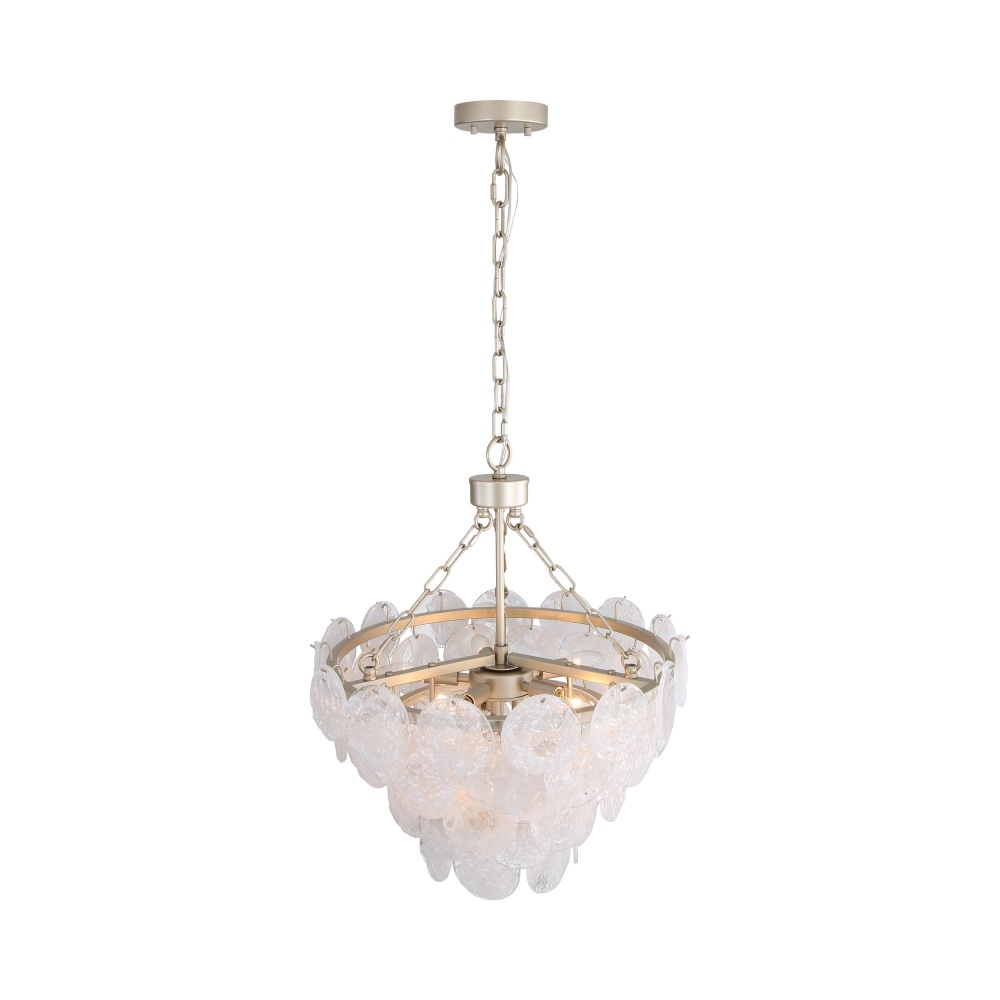 Bring coastal elegance into your home with the Yep by Golden Lighting Cascada 8-light Pendant in Aegean Silver and Cirrus Cloud Glass. Featuring a glass shade, this stunning piece creates a welcoming atmosphere. Each glass shade is an artisanal masterpiece, showcasing a clear base infused with wispy white swirls, and a hammered texture that beautifully catches the light, resulting in a dazzling visual display. The Aegean Silver finish, inspired by artisanal metalwork, adds a sophisticated texture with a soft satin lustre. This refined silver tone is both timeless and versatile, making it an ideal choice for various décor styles. Perfect for kitchens, dining rooms, and doorways, this pendant is dry location rated, making it ideal for indoor spaces. The installation is easy, with sloped-ceiling compatibility and adjustable heights ranging from 27.5" to 101.5". Overall Dimensions: 20.13"W x 23.75"H x 20.13"D. Requires 8 E12 Candelabra base bulbs (not included), max 60 watts per bulb. Elevate your home with this exquisite fixture that embodies quality and style.