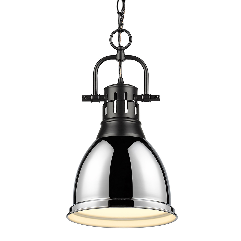 Bring rustic elegance into your home with the Yep by Golden Lighting Duncan 1-light 9in Chain Hung Pendant. Featuring a metal shade and a matte black frame, it creates a welcoming atmosphere. The metal shade beautifully reflects light, offering a timeless appeal with its sleek surface. The epitome of clean, modern style, the matte black finish is smooth to the touch and complements virtually any decor. Perfect for kitchens, dining rooms, or bathrooms, this pendant is damp location rated for spaces with occasional moisture. Installation is a breeze with its sloped-ceiling compatibility and adjustable height (Min: 19.5" - Max: 91.5"). Overall dimensions are 8.88"W x 16.5"H x 8.88"D, using 1 E26 medium base bulb (not included) with a maximum wattage of 100. Elevate your space with this stylish and versatile lighting solution from Yep by Golden Lighting.