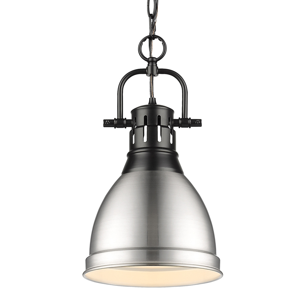 Bring farmhouse elegance into your home with the Yep by Golden Lighting Duncan 1-light 9in Chain Hung Pendant. Featuring a metal shade and a matte black frame, it creates a welcoming atmosphere. The pewter-brushed texture of the metal shade gently diffuses light, producing an elegant and non-glare glow. The matte black finish exemplifies timeless style, offering versatility that complements both modern and rustic decor. Perfect for kitchens, dining rooms, or bedrooms, this pendant is damp location rated, suitable for covered spaces like bathrooms and laundry rooms. Installation is a breeze with sloped-ceiling compatibility and adjustable height ranging from 19.5" to 91.5". The overall dimensions are 8.88"W x 16.5"H x 8.88"D, and it requires 1 E26 medium base bulb (not included) with a maximum wattage of 100. Upgrade your living space with this stylish lighting solution that blends functionality and design.