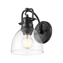 Bring farmhouse elegance into your home with the Yep by Golden Lighting Duncan 1-light Vanity. Featuring a metal shade and a Rubbed Bronze frame, it creates a welcoming atmosphere. The metal shade brings a clean and durable finish that exudes sophistication and adds a rustic charm. Its high-quality construction ensures lasting beauty, fitting perfectly in traditional and transitional spaces. Crafted with an eye for detail, the Rubbed Bronze finish adds a touch of warmth, making it a versatile choice for various stylistic preferences. Brighten up bathrooms with dedicated lighting that flatters while providing practical task illumination. It is Damp Location Rated, suitable for covered and semi-enclosed spaces such as bathrooms, laundry rooms, and covered porches. You can easily customize the lighting with adjustable directional heads that can pivot to highlight specific areas. Overall Dimensions: 6.5"W x 8.5"H x 8.25"D. Requires 1 E26 Medium base bulb (not included), with a maximum wattage of 100. This fixture not only provides illumination but enhances the overall aesthetic of your space, making it an ideal addition to your home décor.