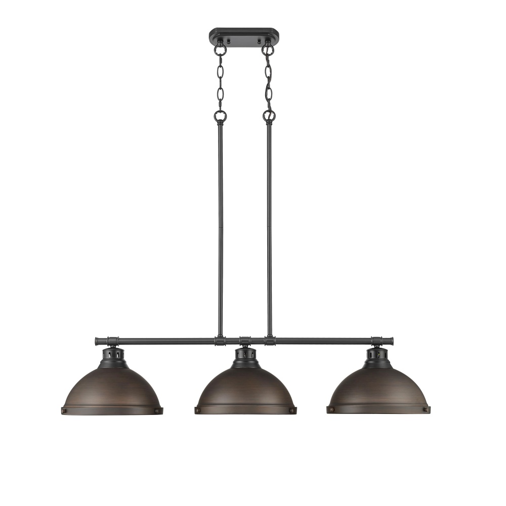 Bring farmhouse elegance into your home with the Yep by Golden Lighting Duncan 3-light Island Light. Featuring a metal shade and a matte black frame, it creates a welcoming atmosphere. The metal shade features a rubbed bronze finish, reflecting a rich, dark brown color with warm coppery highlights that beautifully diffuse light for an inviting glow. The matte black finish is a timeless choice, offering a smooth and sophisticated look that complements various decor styles, from minimalist to industrial. Tailored for kitchen islands, this fixture is dry location rated, making it perfect for indoor spaces not subject to moisture. Its convertible design allows for adjustable height installation, accommodating both sloped and flat ceilings, with a hanging height of 13.125" to 63". Overall dimensions measure 40"W x 8.5"H x 10.88"D and it requires 3 E26 Medium base bulbs (not included), with a maximum wattage of 100 per bulb. Close with lifestyle appeal and quality, making your culinary space both functional and stylish.