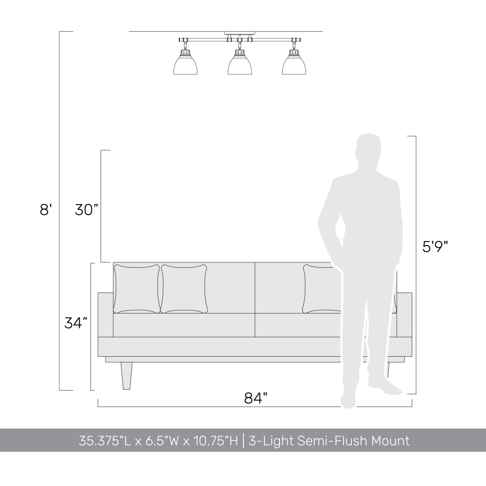 Bring classic charm into your home with the Yep by Golden Lighting Duncan 3-light Semi-Flush Mount. Featuring a metal shade and a chrome frame, it creates a bright atmosphere. The metal shade showcases a White finish that features a solid bright white hue with a high-gloss sheen, ensuring excellent light reflection and easy maintenance. Brilliant and timeless, our Polished Chrome finish offers a sleek, clean look that enhances any space and is easy to clean. This light fixture is damp location rated, suitable for covered or semi-enclosed areas such as bathrooms and porches. The adjustable directional heads allow you to customize the light to highlight specific areas or objects. Overall Dimensions: 35.38"W x 10.75"H x 6.5"D. Requires 3 E26 Medium base bulbs (not included), with a maximum wattage of 100 per bulb. Enhance your living areas with this charming and quality light fixture, perfect for modern and classic interiors alike.