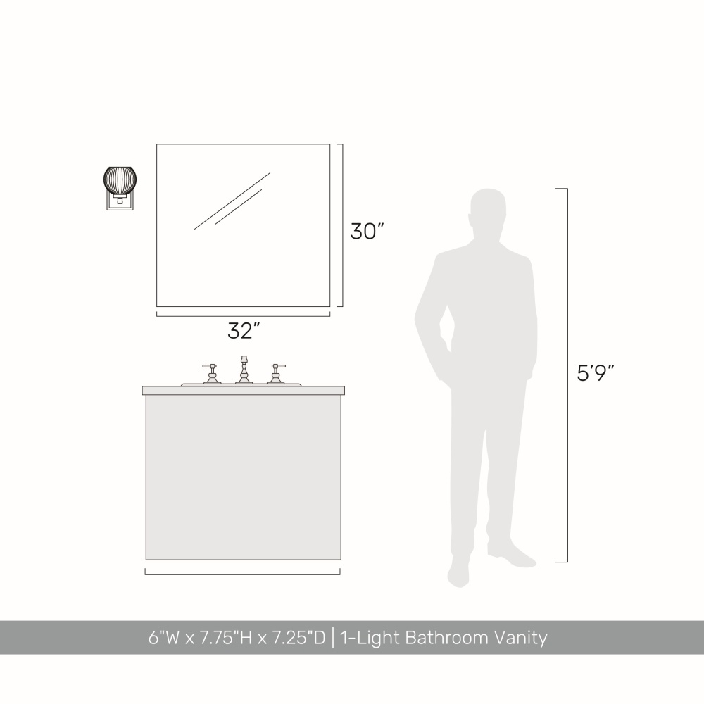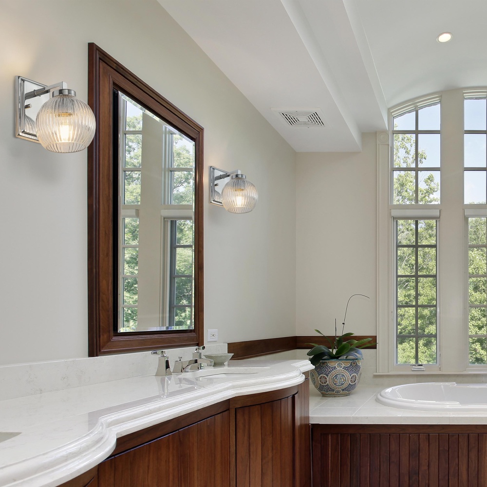 Bring Glam elegance into your home with the Yep by Golden Lighting Elliott 1-light Vanity in Chrome and Clear Ribbed Glass. Featuring a glass shade and a polished chrome frame, it creates a welcoming atmosphere. The clear ribbed glass shade features fine, vertical ribs that capture and refract light, adding a touch of vintage elegance. This classic texture not only enhances the light but also complements both modern and traditional decor. The brilliant Polished Chrome finish offers a crisp, clean look, seamlessly integrating into a wide range of styles. Its highly reflective, mirror-like surface adds brightness and sophistication to any setting. Perfect for enhancing bathrooms, this fixture is Damp Location Rated, making it suitable for covered spaces with occasional moisture. It requires installation but does not compromise on elegance. The overall dimensions are 6"W x 7.75"H x 7.25"D, and it accommodates 1 E26 Medium base bulb (not included) with a maximum wattage of 60. Elevate your space with the luxury and quality of the Yep by Golden Lighting, ensuring both functionality and style in your home decor.