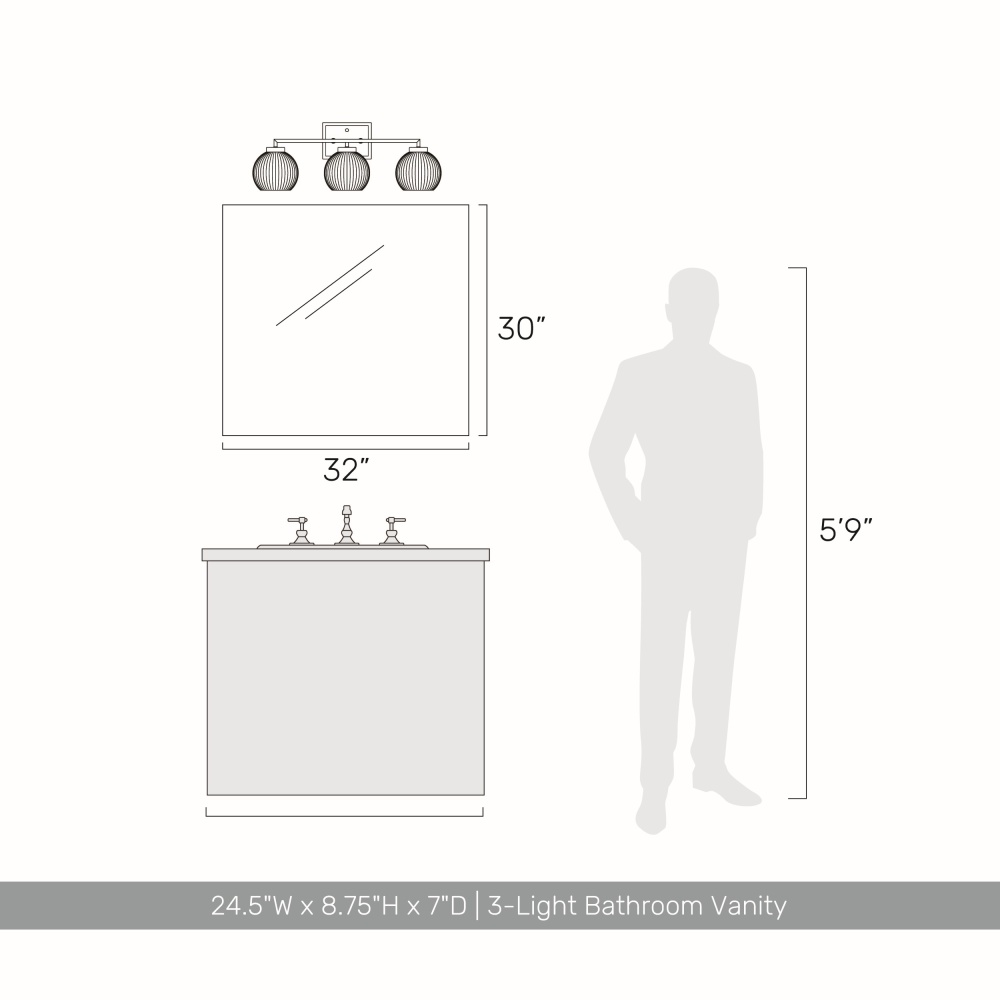 Bring Glam elegance into your home with the Yep by Golden Lighting Elliott 3-light Vanity. Featuring a glass shade and a Pewter frame, it creates a welcoming atmosphere. The Clear Ribbed Glass shade adds a vintage charm with its fine vertical ribs that catch and refract light beautifully. Our Pewter finish offers a soft and classic alternative to brighter silver tones, providing a sophisticated touch to any decor. This vanity light is perfect for brightening up bathrooms while being Damp Location Rated for spaces with occasional moisture. Adjustable installation makes setup a breeze. Dimensions are 24.5"W x 8.75"H x 7"D, requiring 3 E26 Medium base bulbs (not included) with a max 60 wattage per bulb. Experience a perfect blend of modern comfort and timeless style with this stunning fixture.