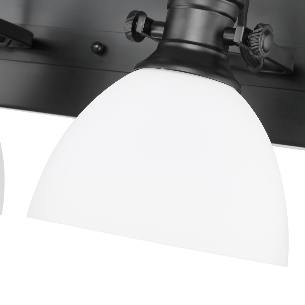 Bring traditional elegance into your home with the Yep by Golden Lighting Hines 4-light Vanity in Matte Black. Featuring an opal glass shade, it creates a welcoming atmosphere. The opal glass shade offers a smooth, satin-matte finish that diffuses light evenly, ensuring a soft, glare-free glow for your space. With its clean Matte Black finish, this fixture provides a sophisticated touch that complements a wide range of decor styles. Perfect for bathrooms, this damp location rated light is safe for use in semi-enclosed spaces, while adjustable directional heads allow you to tailor the lighting to your needs. Overall dimensions measure 34.63"W x 8.75"H x 8.25"D, requiring 4 E26 Medium base bulbs (not included) with a maximum wattage of 60 per bulb. Elevate your space with this beautifully designed fixture that combines both functionality and style.