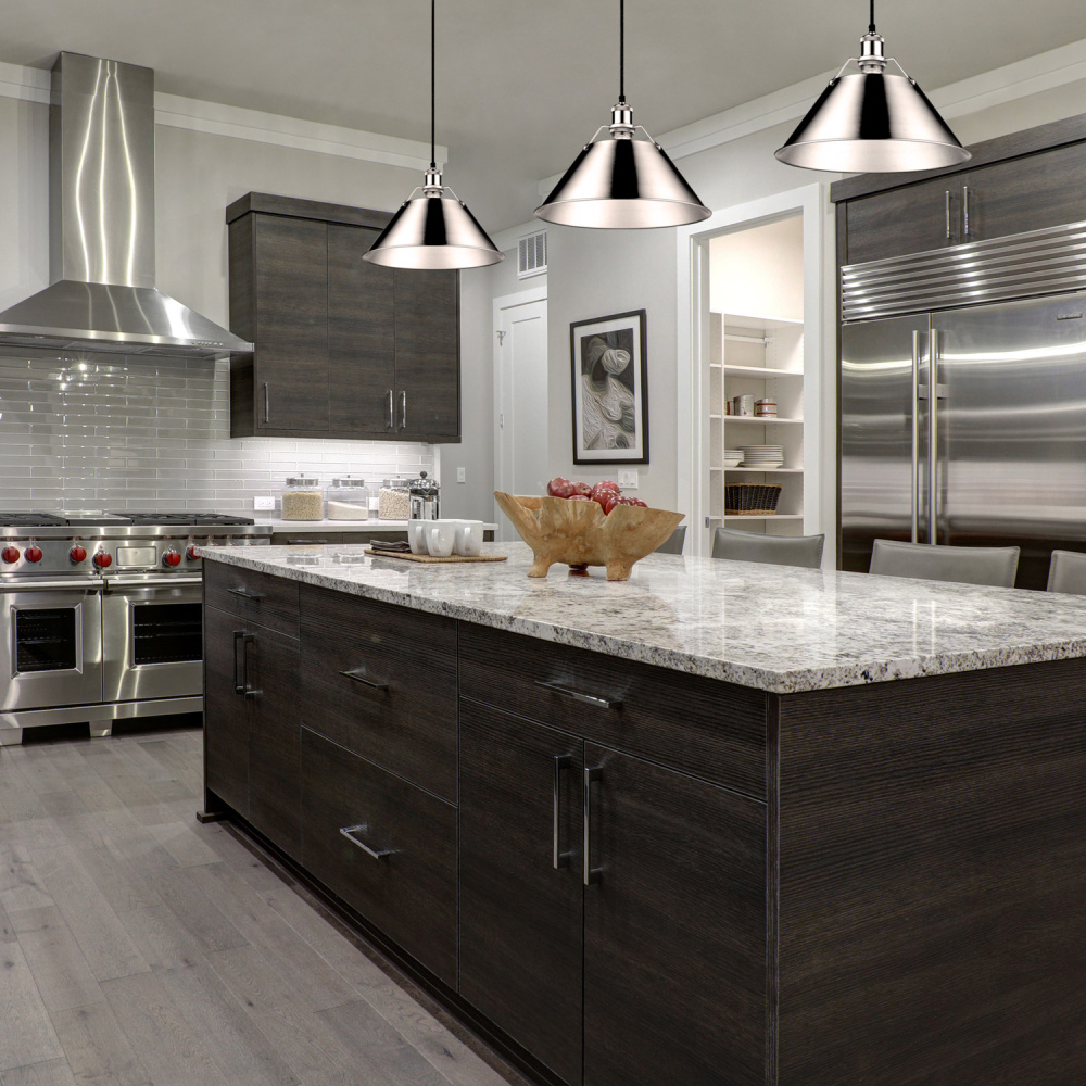 Bring industrial elegance into your home with the Yep by Golden Lighting Orwell 1-light 14in Pendant. Featuring a metal shade and a chrome frame, it creates a welcoming atmosphere. The metal shade highlights a classic Polished Chrome electroplated finish featuring a highly reflective, mirror-like sheen that enhances any space with sleek sophistication. This beautiful finish is both easy-to-clean and adds a touch of brightness and polished perfection to your home. Perfect for kitchens, dining rooms, or bedrooms, this pendant light is Damp Location Rated, suitable for covered and semi-enclosed spaces with occasional moisture, like bathrooms or laundry rooms. Its adjustable height option ensures it fits various ceiling types, allowing you to customize the hanging length from 17.5" to 131.5". Overall Dimensions: 14"W x 10"H x 14"D, requires 1 E26 Medium base bulb (not included), max 100 wattage per bulb. Elevate your space with this versatile pendant light that combines style and functionality, making it a great choice for focused yet decorative illumination.