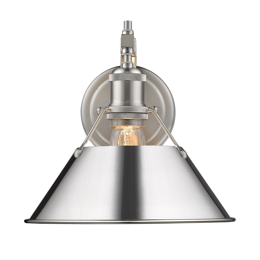 Bring industrial elegance into your home with the Yep by Golden Lighting Orwell 1-light Wall Sconce. Featuring a metal shade and a pewter frame, it creates a welcoming atmosphere. The metal shade provides a stunning, highly reflective surface that enhances the light's brilliance, perfect for creating ambient lighting. Designed with a soft and timeless pewter finish, this sconce complements both classic and contemporary spaces. Suitable for covered and semi-enclosed areas, this fixture enhances hallways, stairways, and bathrooms while offering a touch of vintage charm. Requires 1 E26 Medium base bulb (not included) with a maximum wattage of 100. Overall dimensions are 10"W x 9.63"H x 11"D. Quality craftsmanship and customizable design make this sconce a perfect addition to your decor.