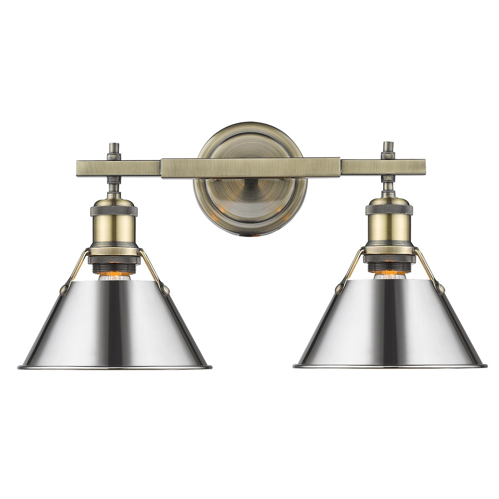 Bring industrial elegance into your home with the Yep by Golden Lighting Orwell 2-light Vanity. Featuring a metal shade and an aged brass frame, it creates a welcoming atmosphere. The metal shade provides a classic touch, while its polished chrome interior reflects light beautifully, enhancing the overall brightness of your space. Embrace timeless elegance with our Aged Brass finish. This sophisticated finish offers a warm, inviting glow, reminiscent of vintage heirlooms and classic hardware. It's created using a durable electroplating process that ensures lasting beauty. Brighten up bathrooms with dedicated lighting that flatters while providing practical task illumination. This fixture is damp location rated, making it suitable for covered spaces like bathrooms and laundry rooms. Overall dimensions are 18.25"W x 9.88"H x 8.5"D, and it requires 2 E26 Medium base bulbs (not included), with a maximum wattage of 100 per bulb. Transform your bathroom with the versatile design of this fixture that encapsulates quality and style.