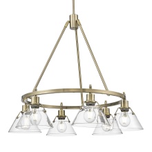 Bring industrial elegance into your home with the Yep by Golden Lighting Orwell 6-light Chandelier. Featuring a metal shade and a matte black frame, it creates a welcoming atmosphere. The rubbed bronze shade adds warmth and richness, delivering a beautiful glow while enhancing the room's decor. The timeless satin finish complements various styles, making it a versatile choice. Ideal for dining rooms, living rooms, and hallways, this chandelier is dry location rated for indoor use. It is sloped-ceiling compatible and adjustable in height from 21.25" to 63.25". Overall dimensions are 29"W x 20.38"H x 29"D, requiring 6 E26 medium base bulbs (not included) with a maximum wattage of 60 per bulb. Transform your space with this stunning piece.